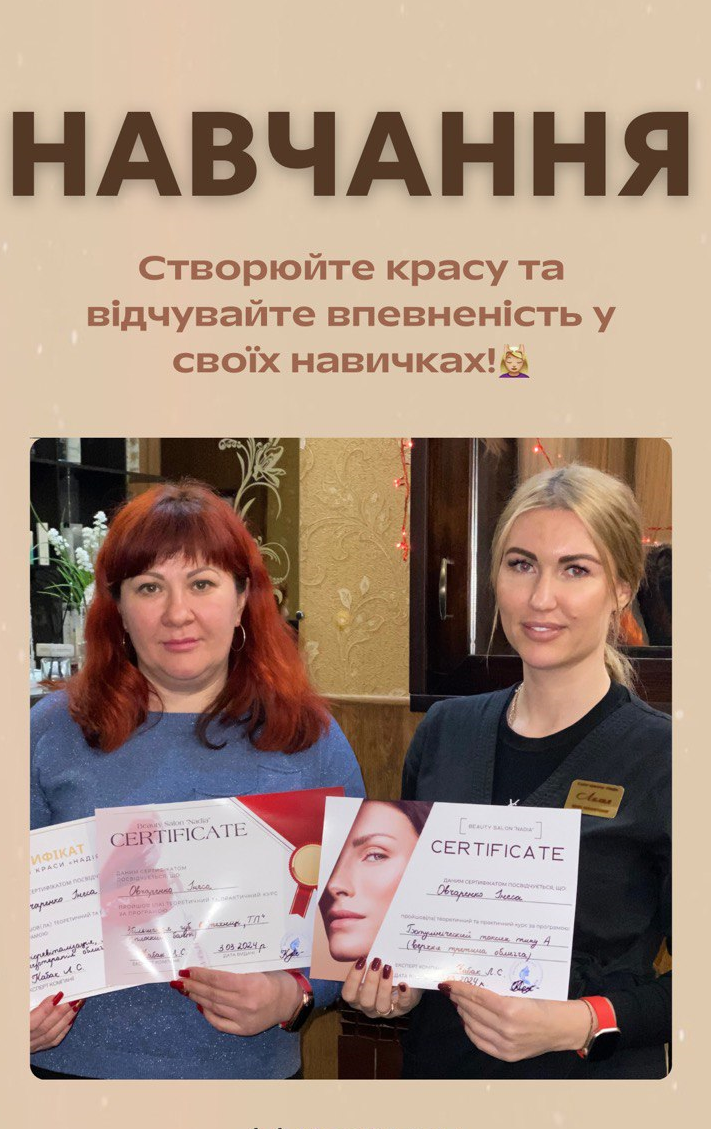 Для курсантів з медичною освітою ми пропонуємо можливість подальшого працевлаштування в салонах краси. По закінченню курсу вам буде видано авторський сертифікат, що підтверджує ваші знання та навички.