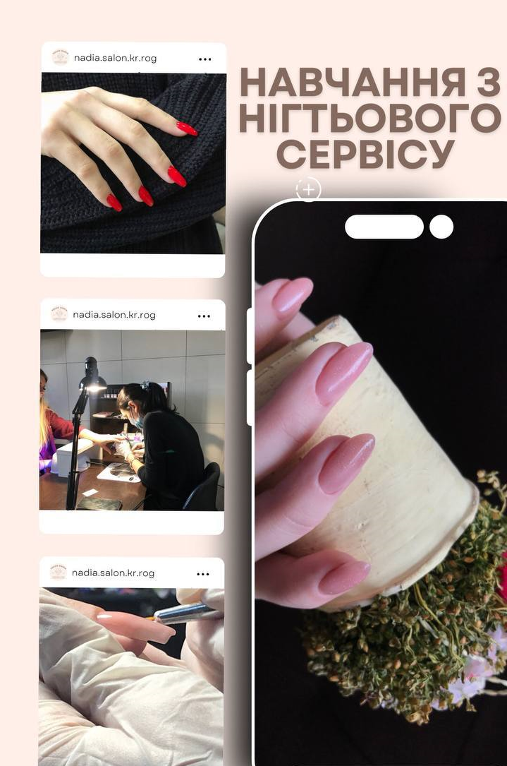 - Апаратний і комбінований манікюр — підбір техніки манікюру відповідно до типу та стану кутикули.