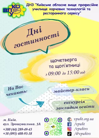 Державний навчальний заклад «Київське обласне вище професійне училище харчових технологій та ресторанного сервісу» запрошує вас на Дні гостинності, які проходять щочетверга та щоп'ятниці з 09 до 15 год.